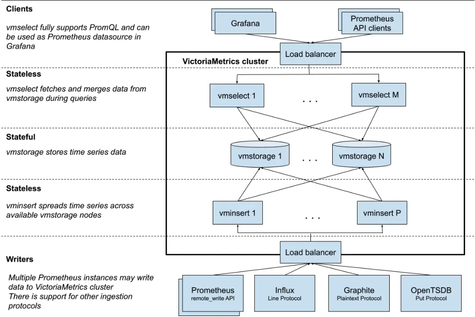 - vmstorage 노드들 간에는 어떠한 것도 공유되지 않아, 가용성을 높이고 클러스터 scaling같은 유지보수를 단순화한다. 이를 shared nothing architecture라고 한다.