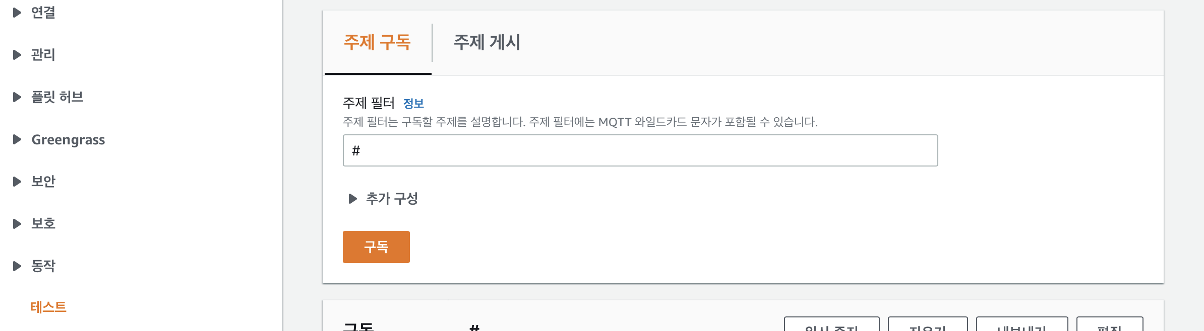 퍼블리싱 되는 데이터를 바로 확인하려면 IoT Core 콘솔에서 테스트 페이지에서 바로 확인 할 수 있다.
