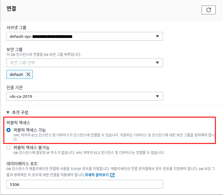 만약, 나와 같이 초기 데이터베이스 생성시에 손쉬운 생성을 선택했거나 퍼블릭 엑세스 불가능 설정을 하였다면 추가로 설정이 퍼블릭 엑세스를 허용해 주어야 한다.