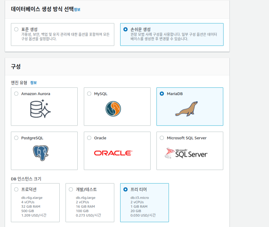 데이터베이스 엔진을 선택한다. 나는 MariaDB를 사용하며, 무료로 사용가능한 프리티어 인스턴스 크기를 선택했다.