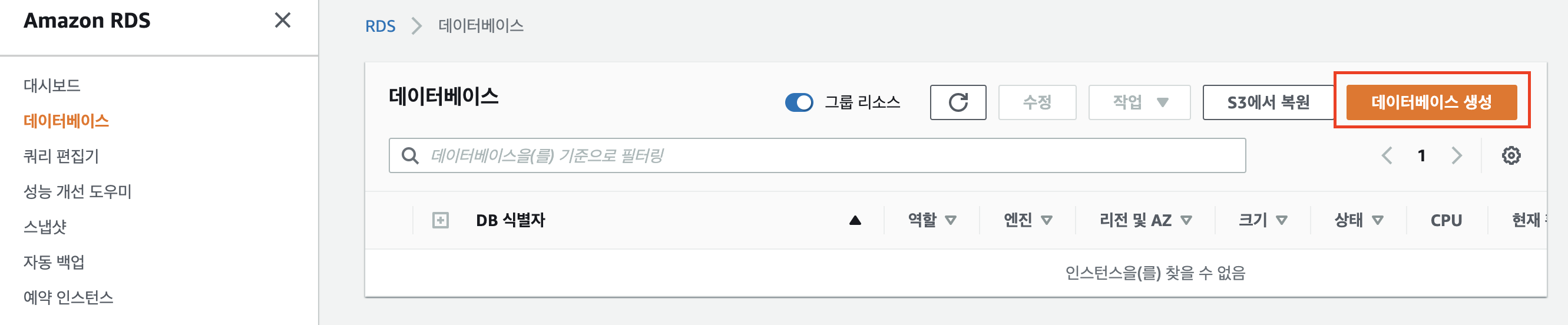RDS 인스턴스를 생성하기 위해선 AWS에 로그인 후, RDS 콘솔에 접속하여 데이터베이스 페이지에서 데이터베이스 생성 버튼 클릭한다.