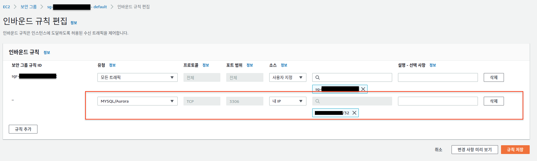 인바운드 규칙 추가에서 유형: MySQL/Aurora를 선택한다. 이렇게 하면 기본으로 프로토콜(TCP), 포트(3306)가 설정된다.