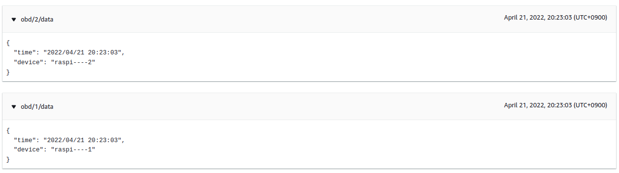 내 경우에는 라즈베리파이 2대를 동시에 퍼블리싱 시켰는데, 두개의 디바이스에서 모두 정상적으로 퍼블리싱 되고 있는 것을 확인 할 수 있다.