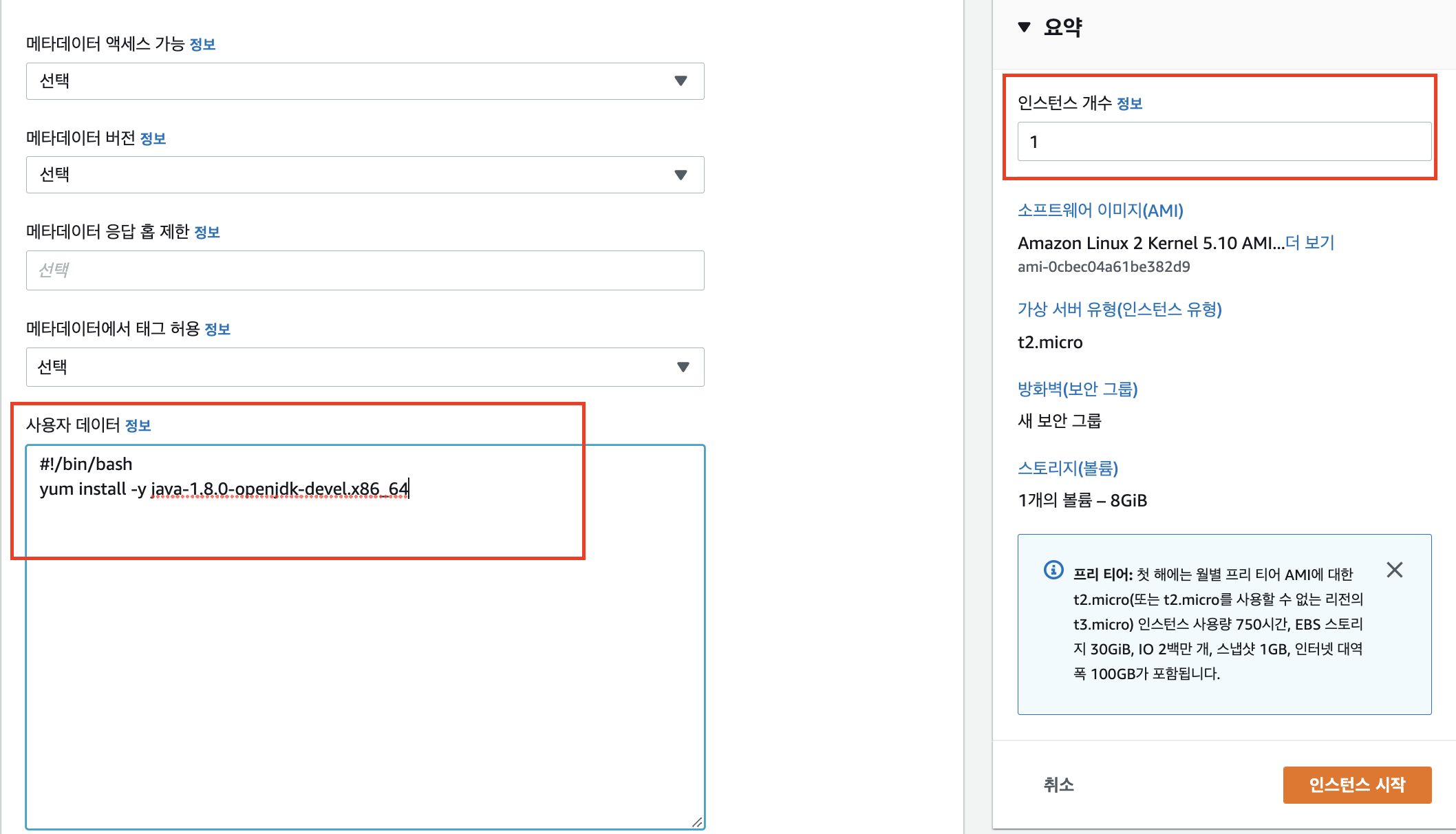 예를들어서 <아마존 리눅스, t2.micro> 인스턴스 2개를 생성하되, 자바를 생성과 동시에 설치되도록 하려고 한다.