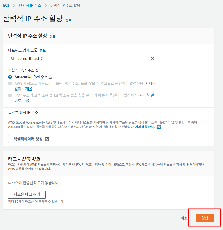 탄력적 IP 창에 들어가면 오른쪽 상단에 “탄력적 IP주소 할당”이라는 버튼이 있다. 해당 버튼을 클릭해서 EIP를 생성한다. 할당 페이지로 넘어가면, 기본 설정되어있는 상태에서 할당 클릭한다.