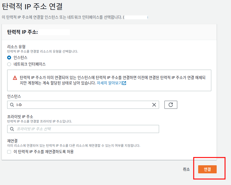 연결 설정 창에서 리소스유형을 인스턴스로 선택하고, 탄력적 IP(EIP)를 연결하고자 하는 EC2인스턴스를 선택한다.