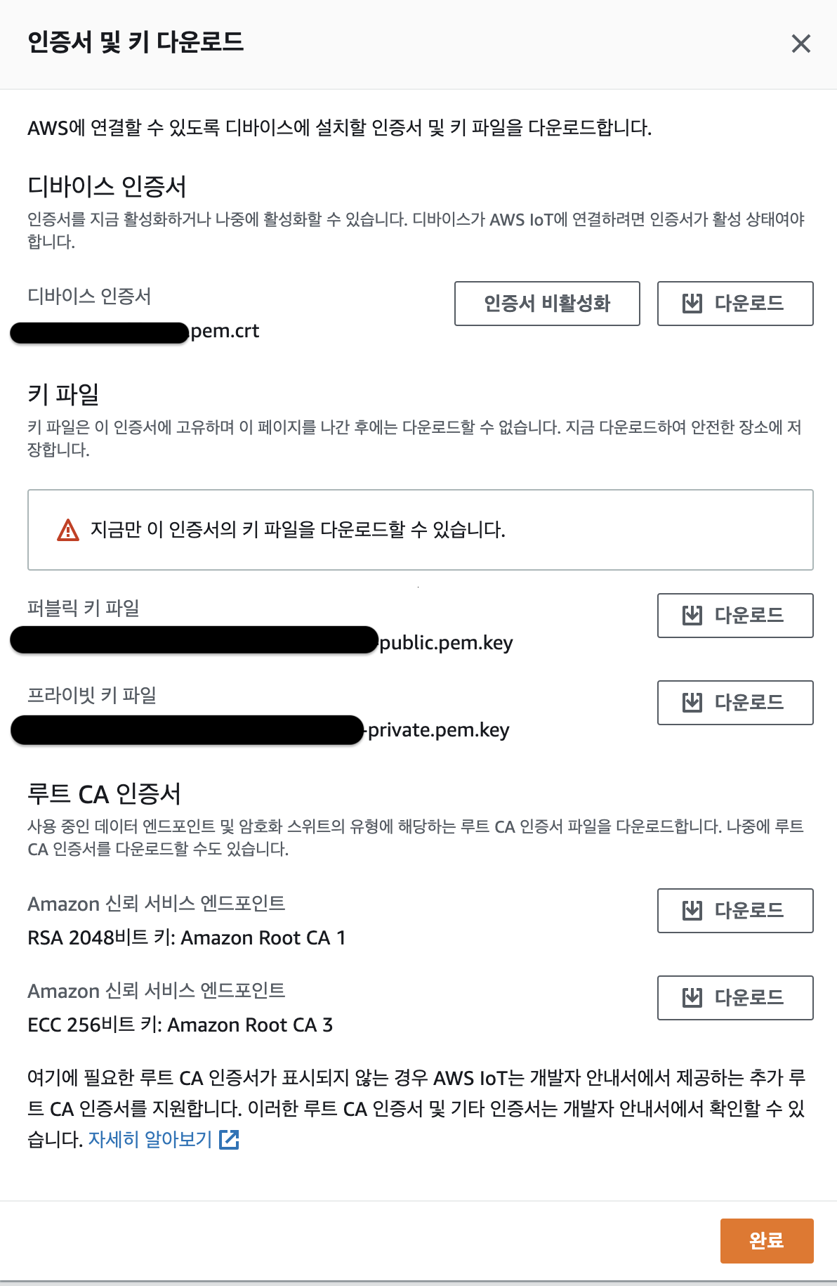 사물생성이 완료되면 인증서 및 키를 다운로드 할수 있는 페이지가 나온다. 여기서 클라이언트 디바이스에 설치할 인증서와 키 파일을 다운로드 하면된다.