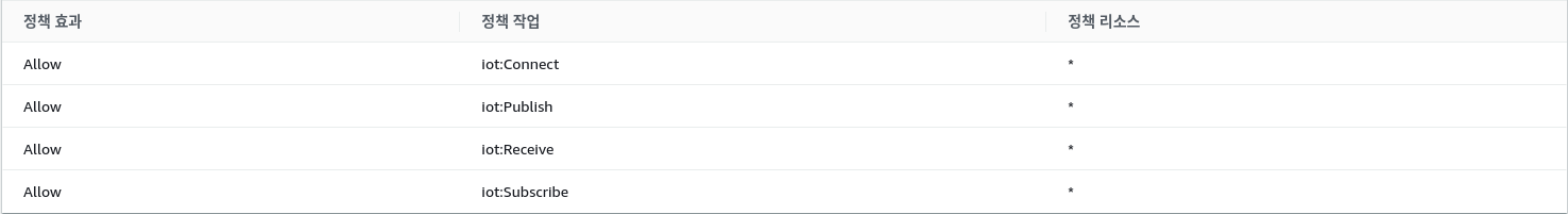 이제 정책 작업과 정책 리소스를 추가해주면 되는데, 쉽게 말하면 여기서 지정된 리소스들에 한해서 지정된 작업을 수행하도록 권한을 주는것이다. 이번에는 공식홈페이지 튜토리얼을 따라 아래와 같이 설정하였다. 그러나, 보안을 강화하기 위해서는 추후에 와일드카드 문자가 아닌 클라이언트 ARN으로 변경해야 한다.