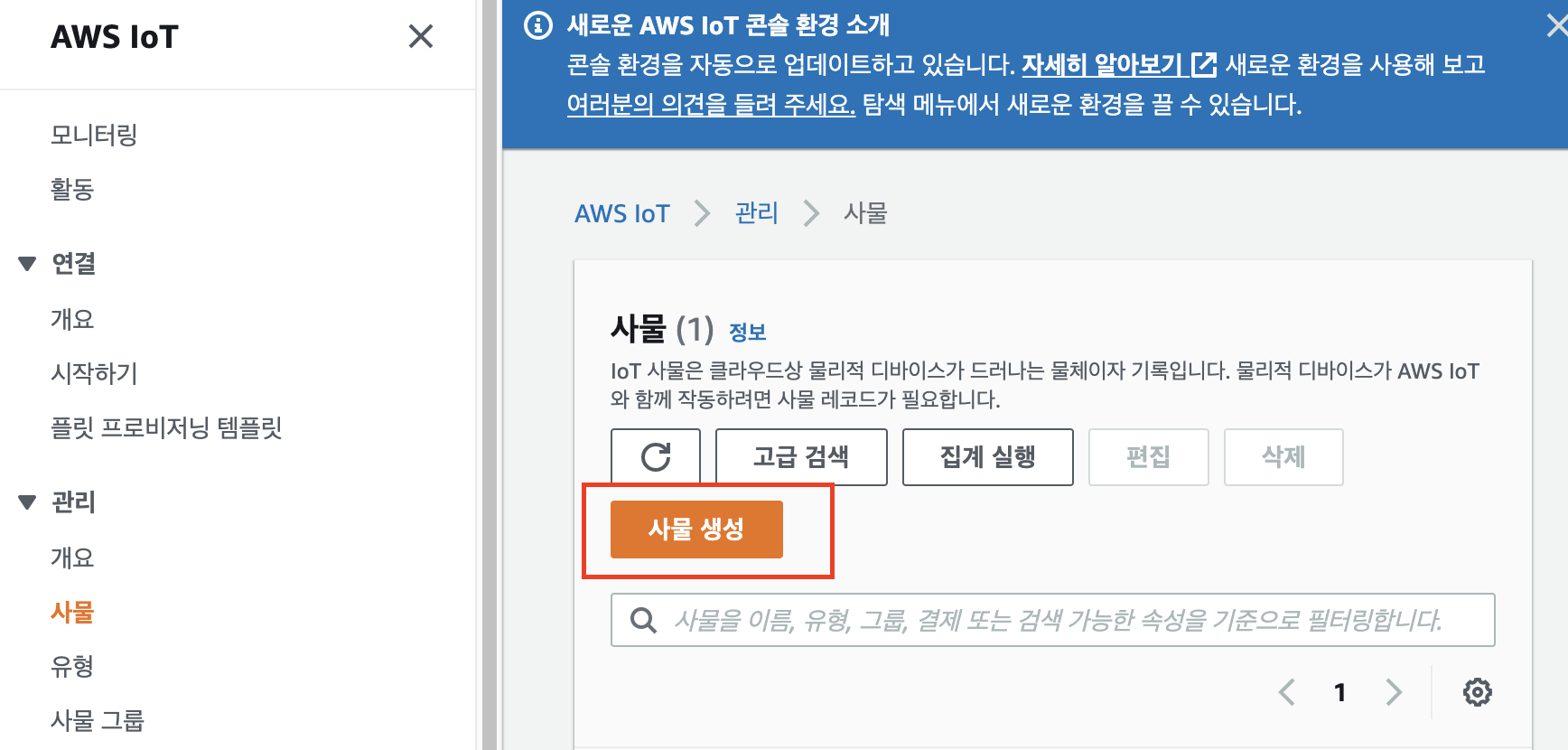 정책 생성이 완료 되었으면, 다시 IoT 콘솔에서 관리 메뉴의 사물을 선택하여 사물을 생성하도록 한다. 사물객체는 AWS IoT에 연결된 특정 디바이스 또는 논리적 엔터티를 나타낸다.