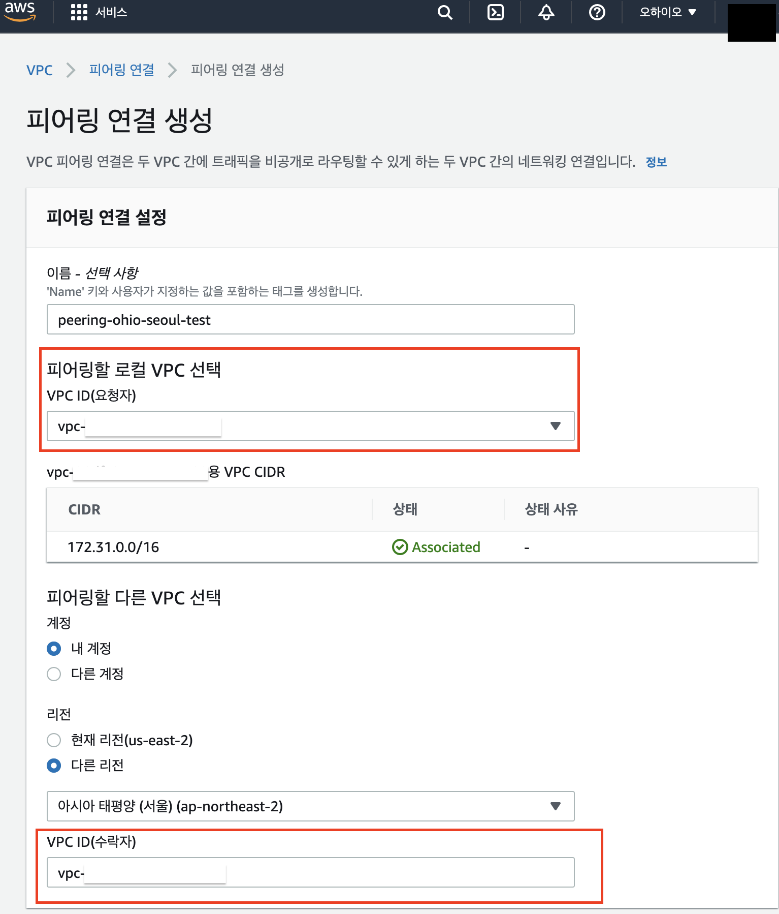 나는 ohio 리전의 VPC가 연결을 신청하도록 하였고, seoul 리전의 VPC를 피어링 대상으로 입력했다. 아래 화면에서 확인 가능하듯이, 다른 계정, 다른 리전, 동일 리전 내 모든 VPC와의 연결이 가능하다.