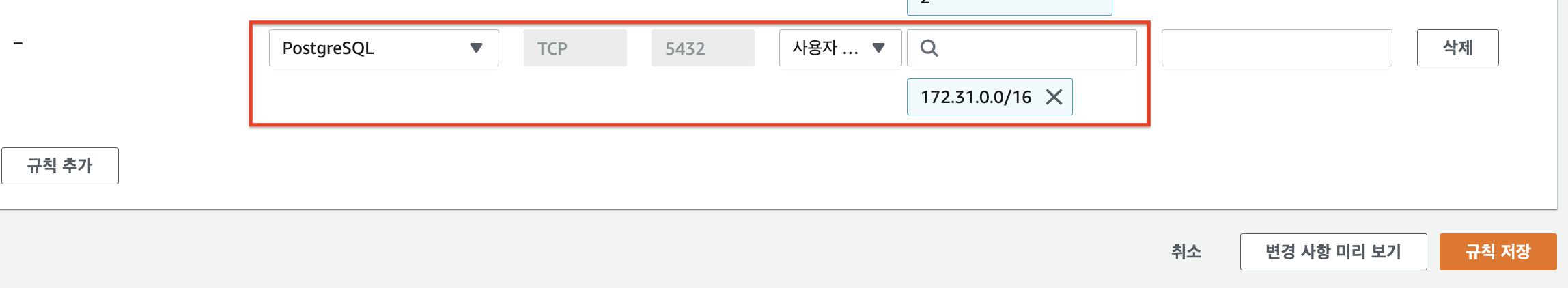 ⚠️ 보안그룹의 소스는 같은 리전일 경우에는 연결하고자 하는 인스턴스의 보안그룹을 입력하고,