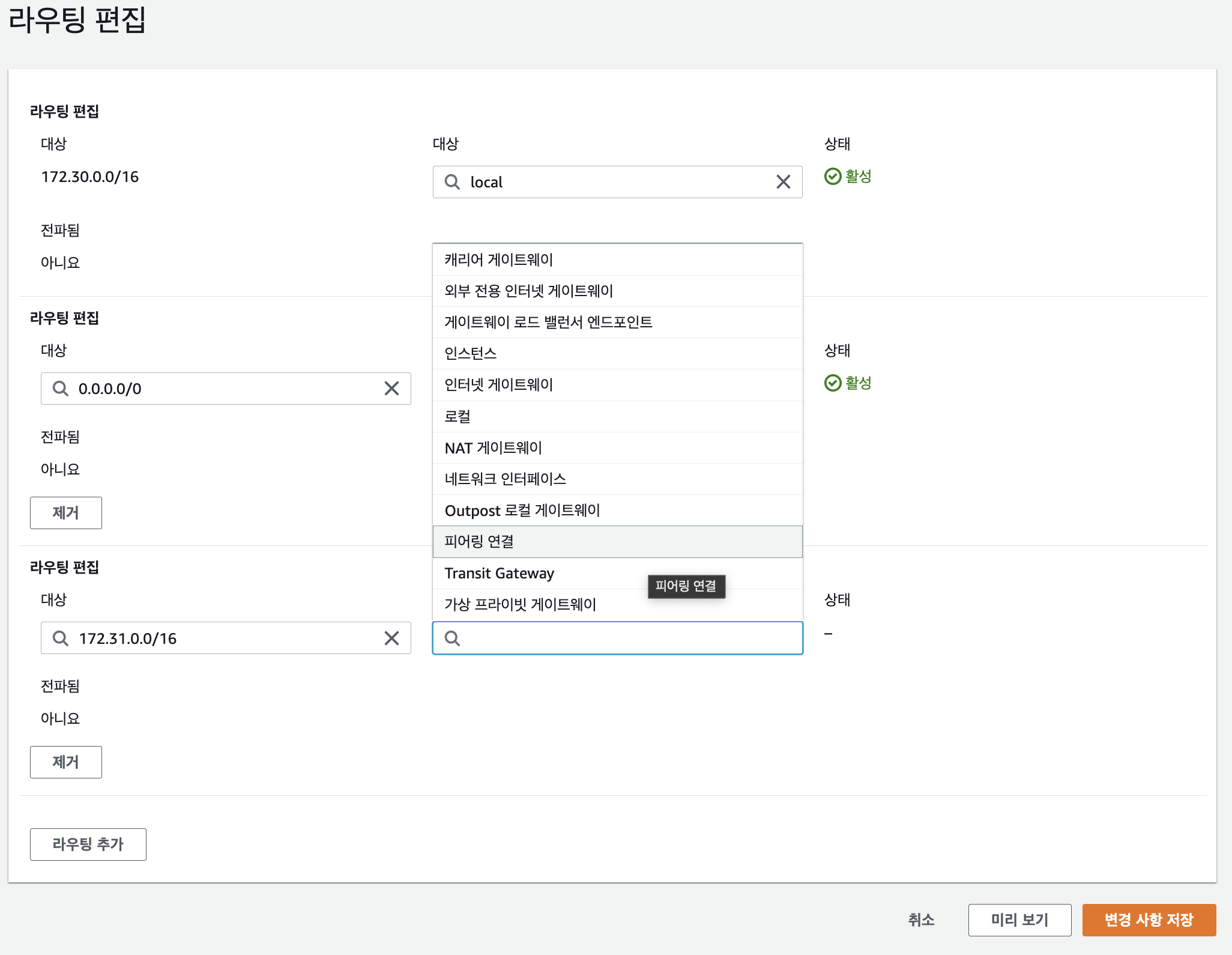 콘솔 메뉴바에서 라우팅 테이블을 선택하고, 피어링 연결된 VPC의 라우팅 테이블을 선택한다. 하단의 라우팅 편집을 클릭해 편집 창으로 접속해서 라우팅을 추가해준다.