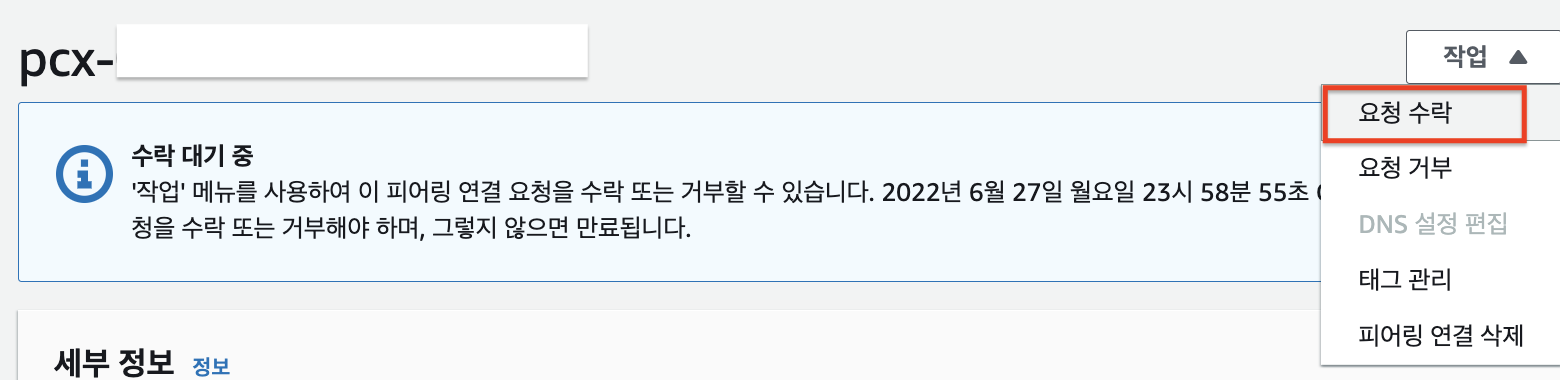 이제 안내메세지를 따라 서울리전으로 변경해서 요청을 수락한다. 대상 VPC의 리전으로 이동하면, 아래와 같이 연결을 수락하라는 안내 메세지가 나온다. 여기서 작업 → 요청 수락을 선택하여 요청을 수락한다.