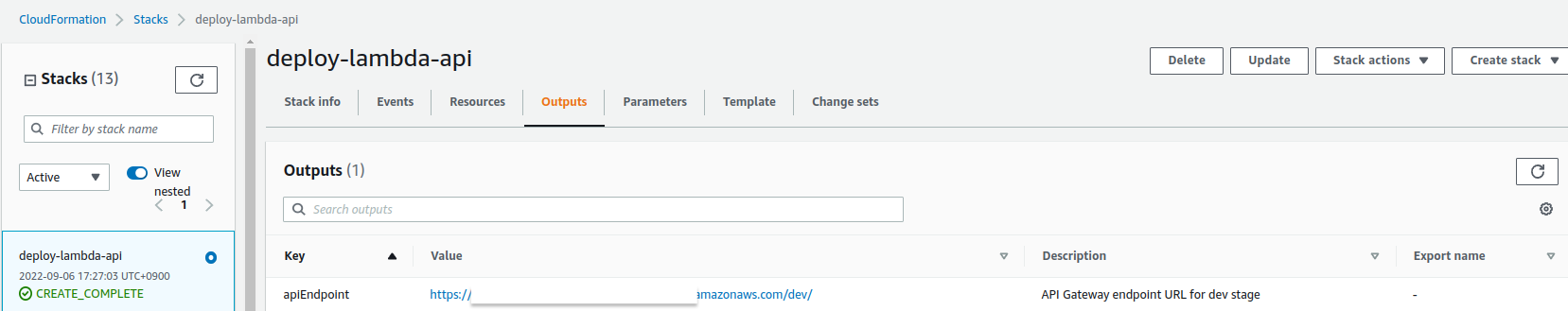 이제 AWS에 접속해서 Cloudformation의 output을 확인 하면, 생성한 API의 Base 주소가 출력된것을 확인 할 수 있다.