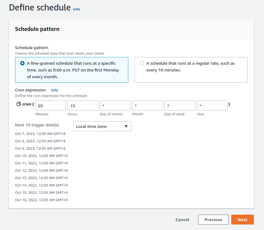 Eventbridge 콘솔에서 Rule 생성을 시작하고, 스케쥴 패턴을 설정한다.