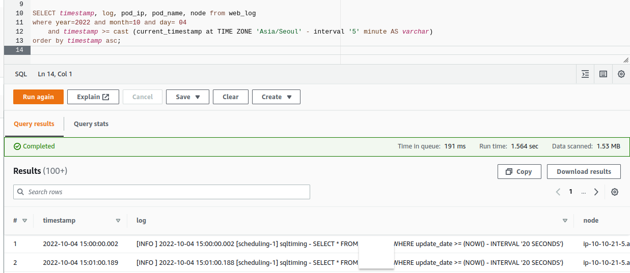 이제, 설정한 파티션을 where 조건에 포함해서 쿼리를 실행하면 된다. 아래는 select문 예시이다.