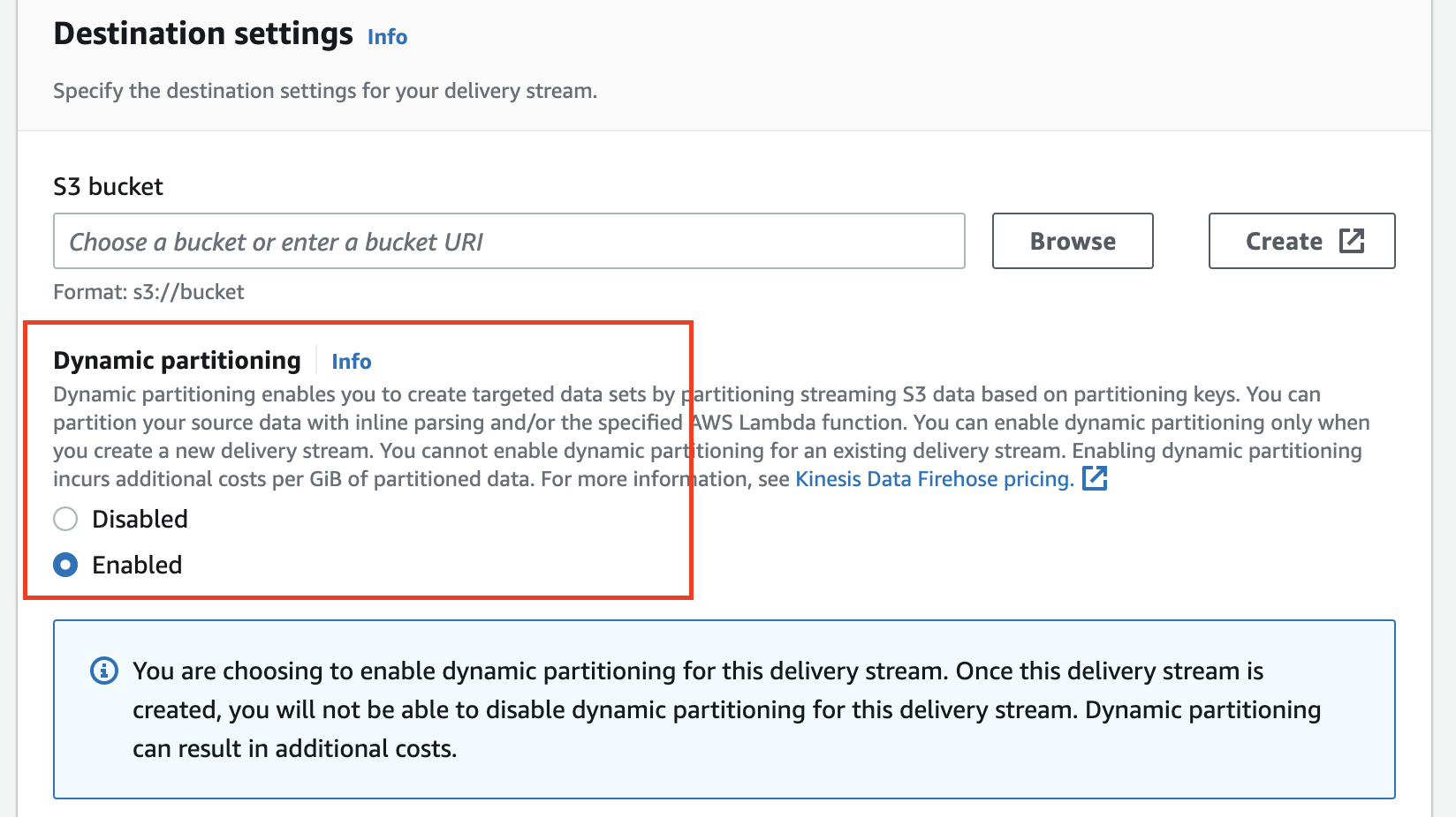 Firehose를 새로 생성하는 과정에서 Destination Settings 섹션이 있다. 여기서 데이터를 저장할 S3 버킷을 설정하고, Dynamic partitioning을 enabled 시켜준다.