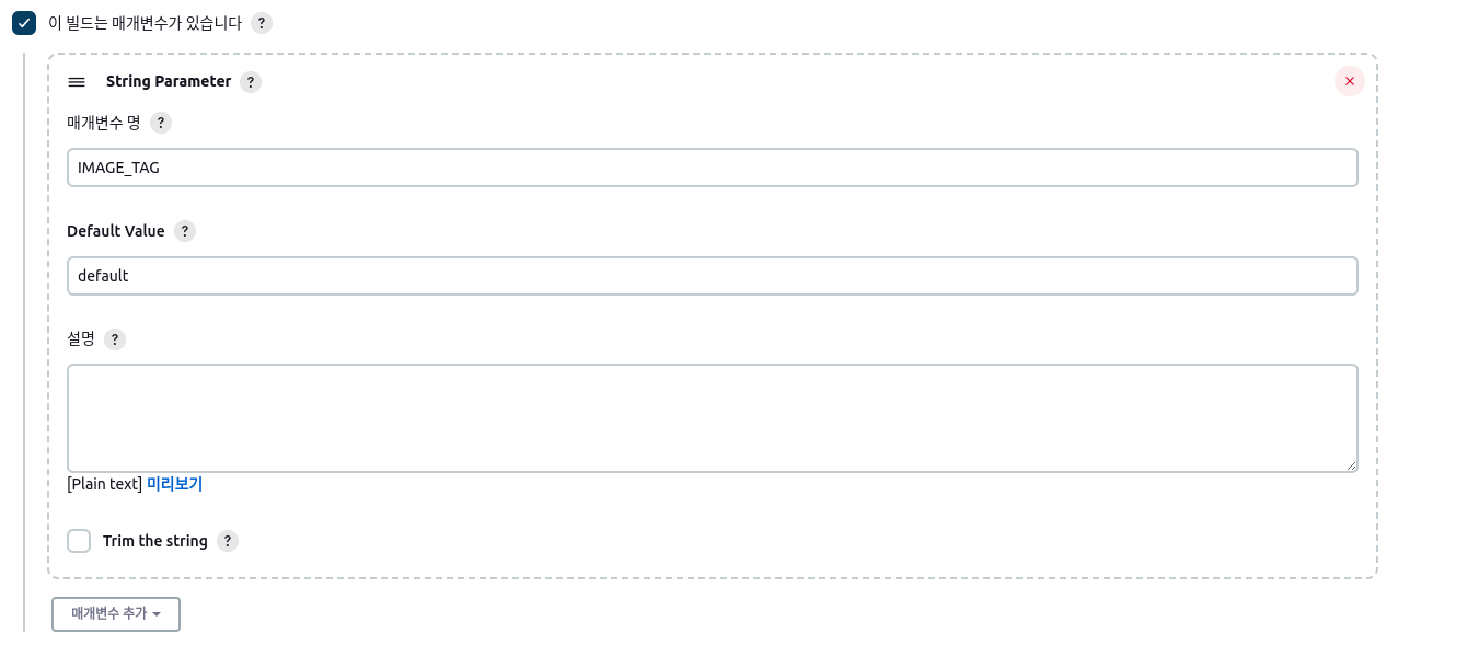 즉, Job2에서는 IMAGE_TAG 라는 변수가 0.1.<Job1의 build Id(기본값은 build number로 부여된다.)>의 값으로 등록된다.