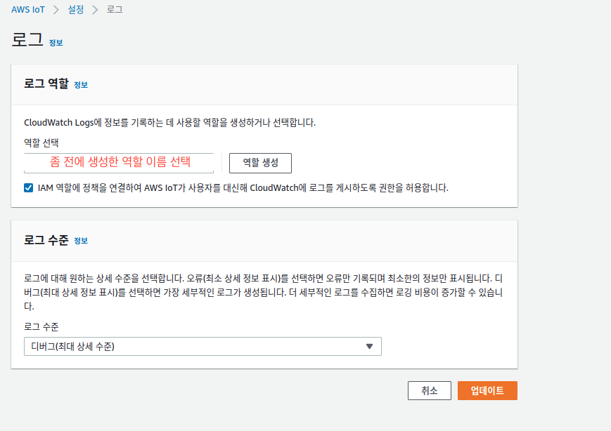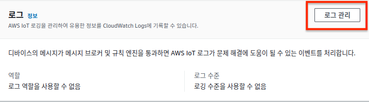 IAM역할을 생성했으면 AWS IoT 콘솔로 넘어가서 기본 로깅을 구성한다.