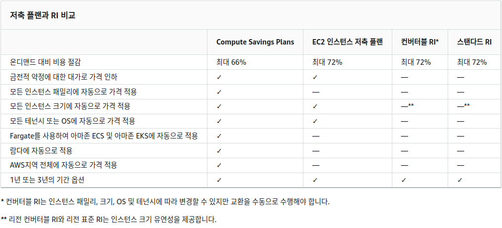 Savings Plans는 1년 또는 3년 동안 시간당 컴퓨팅 파워을 약정하여 EC2, Lambda, Fargate 및 SageMaker 사용량에 대해 저렴한 가격을 제공하는 할인 모델(최대 72%)
